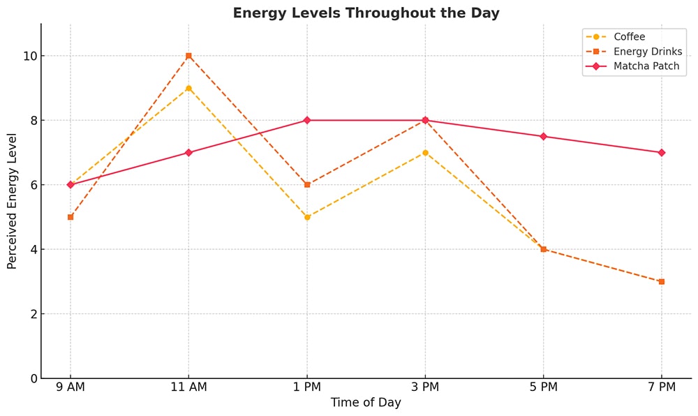 This chart shows how energy levels naturally dip after lunch, spike–and–crash with coffee or energy drinks, but stay smooth and high for hours with the slow, even release of a Matcha Patch.