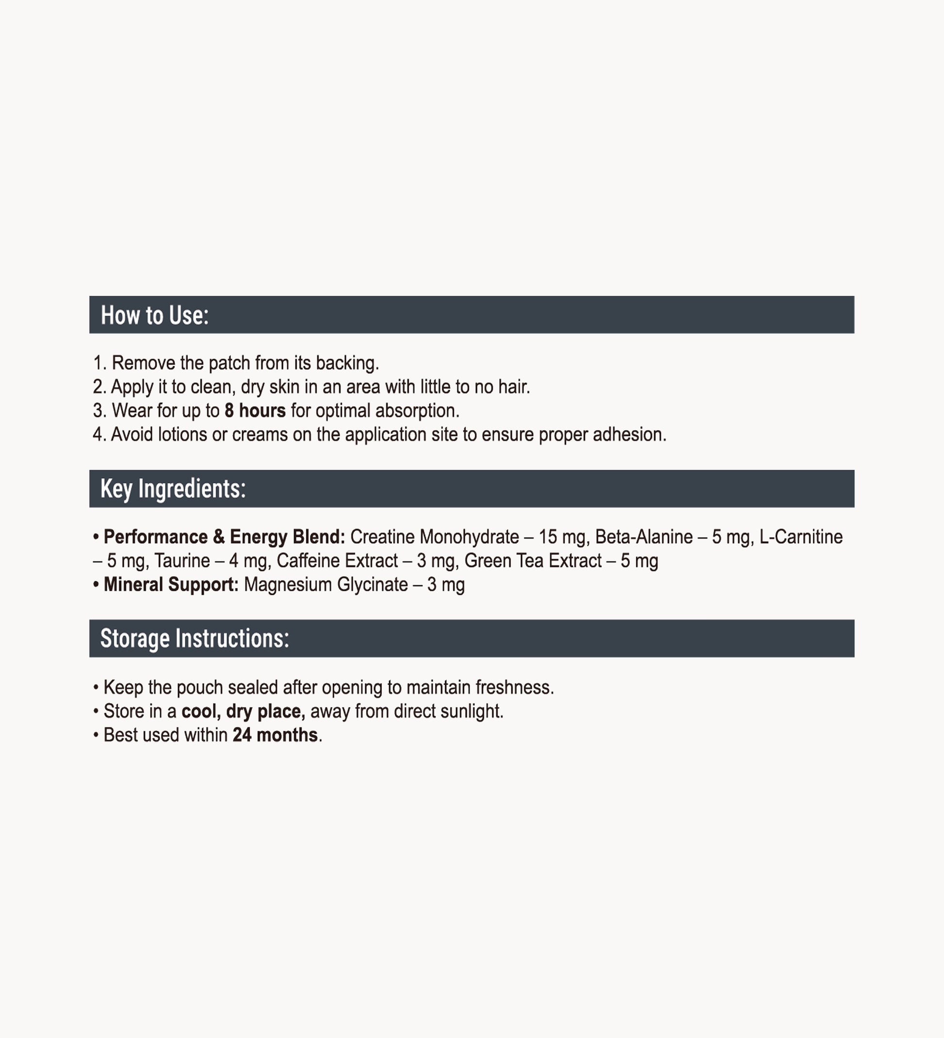 Formulated with a potent Performance & Energy Blend featuring Creatine, Beta-Alanine, and L-Carnitine — plus natural caffeine and Green Tea Extract — these patches support lean muscle growth, reduce fatigue, and enhance recovery.
