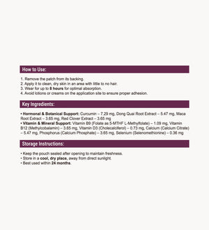 Formulated with botanicals like Dong Quai, Maca, and Red Clover — plus key vitamins and minerals including B12, D3, Calcium, and Selenium — these patches help promote balance, reduce discomfort, and support natural energy.